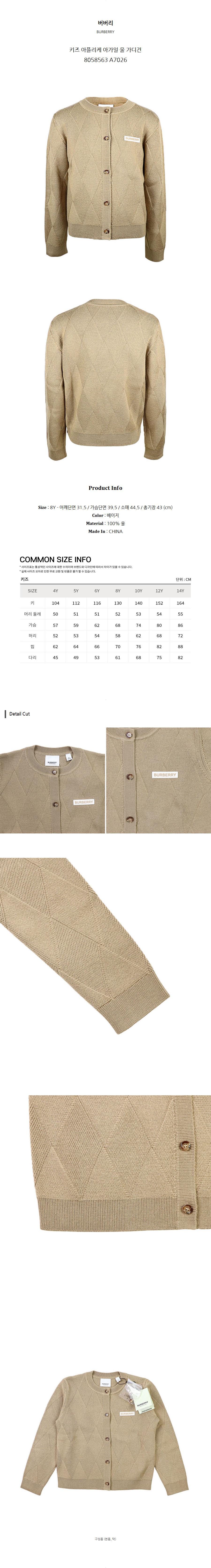 버버리 키즈 아플리케 아가일 울 가디건 8058563 A7026 (8Y)